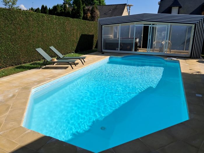 A Chevaigné, sur un terrain de 581 m², charmante maison de 131 m² comprenant : un sous-sol complet avec arrière-cuisine, espace buanderie, W.C. et douche, garage, atelier, cave ; au rez-de-chaussée : entrée avec placard, cuisine aménagée, salon séjour, salle à manger avec cheminée, une chambre avec placard, W.C., lingerie ; à l'étage : palier avec placard, desservant trois chambres dont deux avec placards, salle de bains, W.C., petit grenier. Jardin avec espace potager. Carport. Piscine couverte, chauffée et modulable grâce à sa structure découvrable, Jacuzzi. Chauffage électrique. Assainissement collectif. Classe énergétique D (241) ; B (7). Prix net vendeur : 350.000,00 € + hono. négo : 11.800,00 €